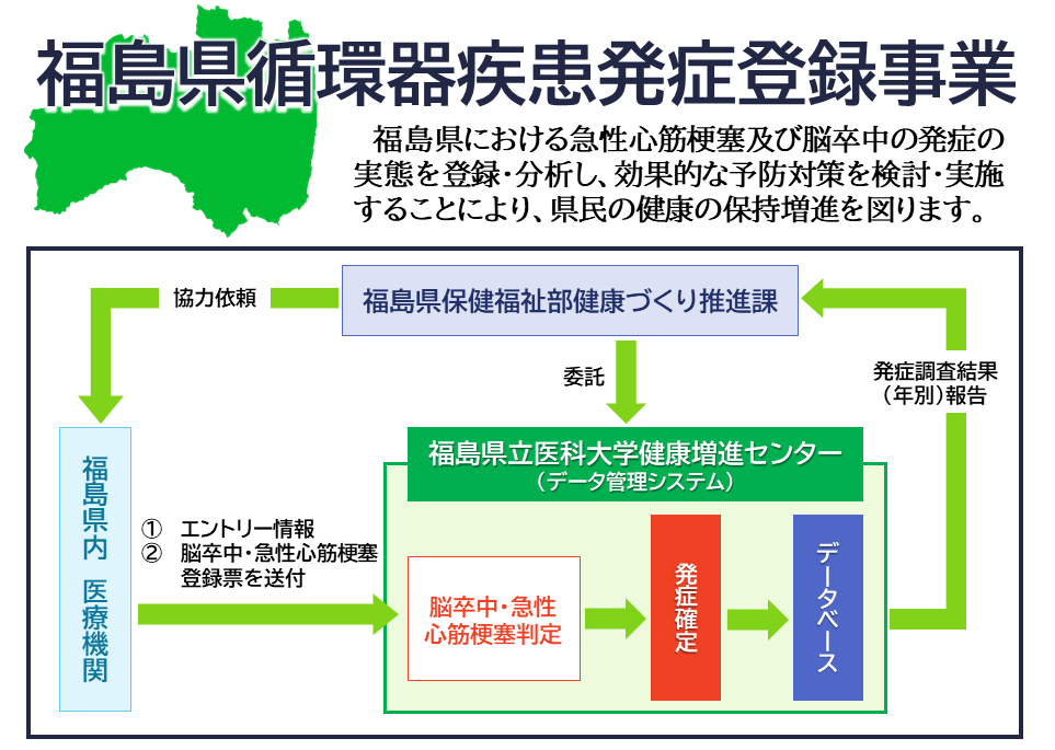 福島県では、平成27年の急性心筋梗塞の年齢調整死亡率が男女共に全国で第1位、脳梗塞の年齢調整死亡率が全国で男性7位、女性5位と高い状態にあります。このことから、全県における急性心筋梗塞及び脳卒中の発症の実態等を把握し、効果的な予防対策を検討・実施することにより健康寿命の延伸を図ることを目的に、福島県循環器疾患発症登録事業を実施しています。当センターでは、県からの委託で、登録情報の収集、整理、データ化、解析及び報告書の作成を行っています。